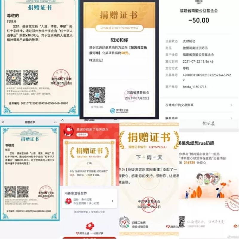 公司部分员工为防汛救灾的捐款证书