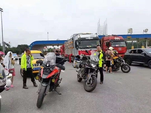 摩托车队在高速口为外地救援车辆进行人工导航