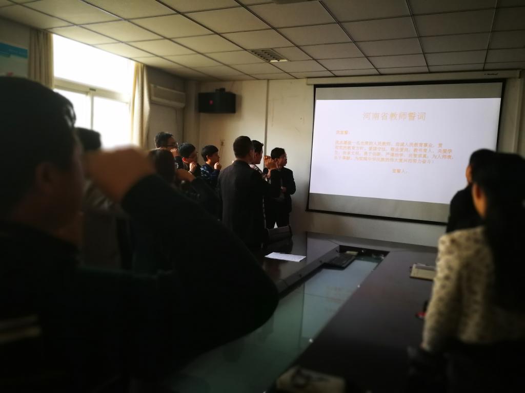 潘书记传达了河南省教育厅关于《河南教师誓词(试行)》的通知。并组织全体与会教师开展宣誓活动。