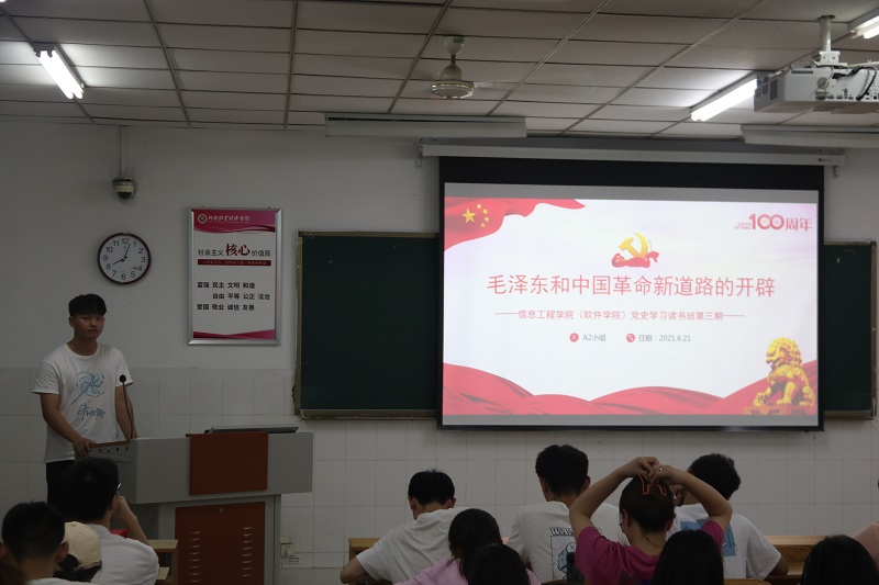 本次活动由小组成员代表李泽巍担任主讲人。李泽巍同学先带领着大家认真观看了“霹雳暴动秋收起义,武装夺取政权的新道路”视频短片,一同回顾建党初期革命事业开展的筚路蓝缕。让同学们感受到艰苦岁月的磨难与革命领袖的精神气魄,在场师生无不动容。随后他从“从进攻城市到向农村的艰难转变”等四个方面介绍中国革命新道路的开辟。通过他的讲述,同学们详细地了解了中国革命道路转变的背景知识、八七会议对于斗争形式转变的重要意义、中国革命道路理论内容及意义等。最后,李泽巍同学鼓励大家认真学习党史,适应时代潮流的发展需要,努力为社会主义现代化建设做贡献。