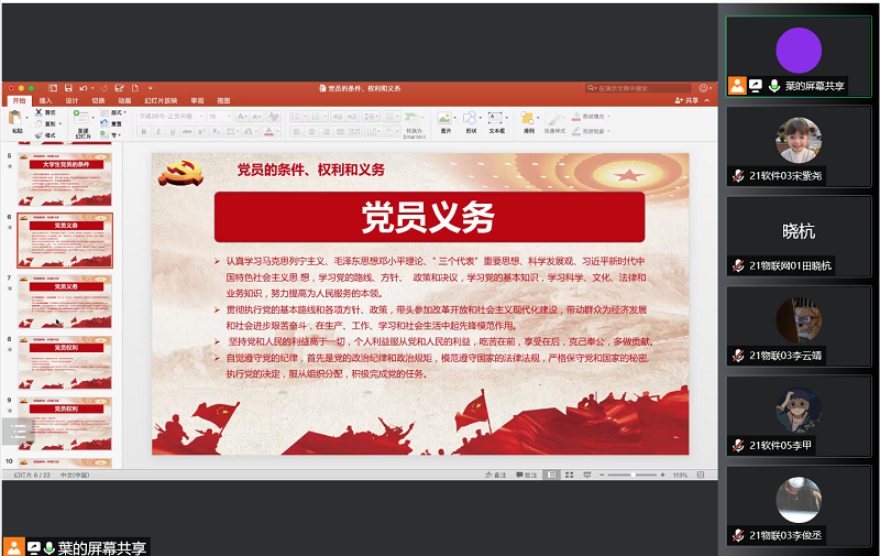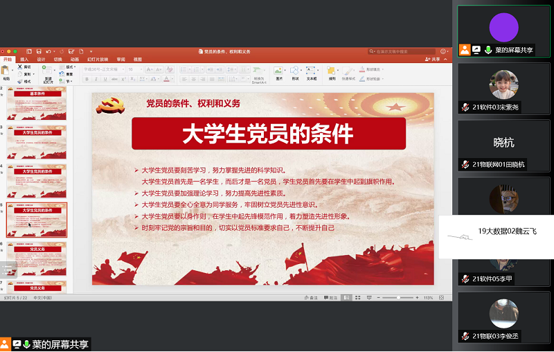 2022年3月27日晚七点,公司开展了2022年第一期入党积极分子培训班第七讲。公司叶子老师为入党积极分子开展了以《中国共产党党员的条件、义务及权利》为主题的党课分享。