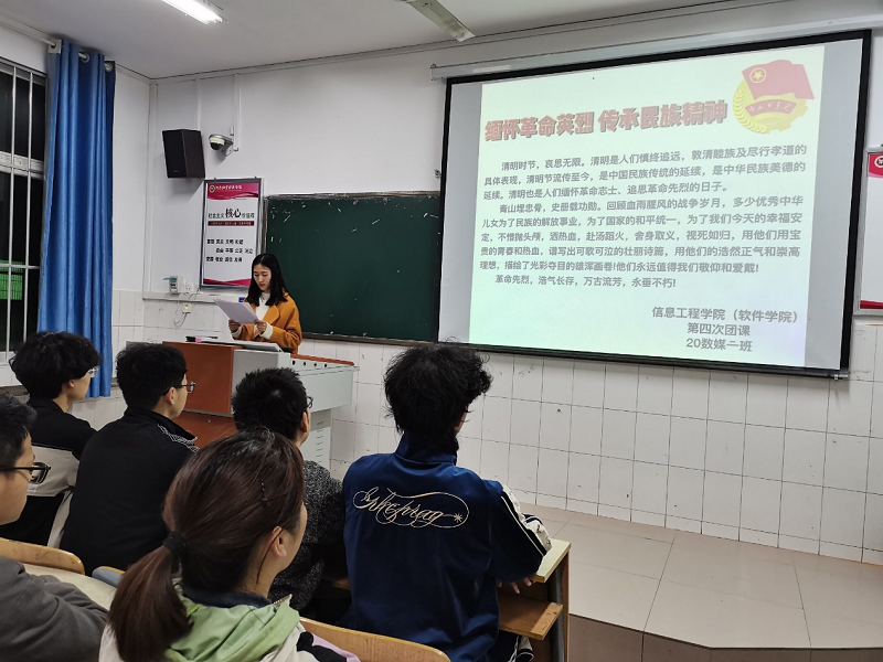 成为共青团中的一员是新时代青年必经之路,承载着党与团的希望与责任。团课伊始,主讲人各班级团支书带着大家了解了革命英烈的光荣历史,并将其爱国主义民族精神进行传达,同时也向同学们提出要认真学习并弘扬民族精神,担当起民族复兴的大任。同学们积极配合并纷纷表示将会向革命英烈致敬缅怀,加强自身民族自信心,担当历史责任。