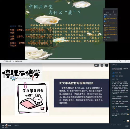 首先,各班团支书提出本次团课主题,通过列举河南此次洪灾疫情中所展现出的主要英雄事迹,引导同学们深刻理解中国共产党为什么“能”、马克思主义为什么“行”,中国特色社会主义为什么“好”。接着,播放此次残奥会相关视频,视频中展现出了奥运健儿们的飒爽英姿,他们克服种种困难,最终坚持不懈地完成比赛,他们身上体现出了崇高的爱国主义和集体主义精神以及与祖国共奋进、同人民共命运的爱国情怀。同学们看后都深受鼓舞,立志学习他们自强不息、顽强拼搏的意志品质,脚踏实地、苦练本领的扎实作风。最后,各班同学对居家在线学习开展经验分享交流,讨论学习中遇到的各种问题,并为适应网络教学、提升在线学习能力提出意见,以期促进学业发展。