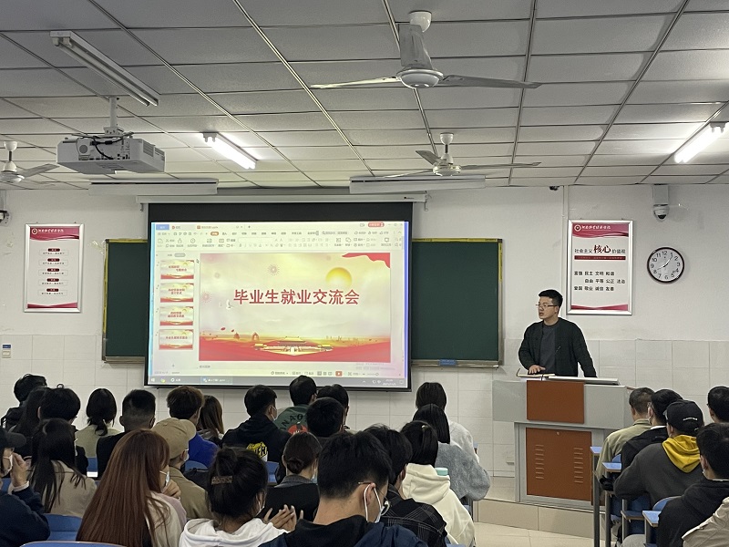 会议分为三个方面。首先,辅导员陈芃睿老师主持讲话,说明了此次毕业生就业经验交流会的目的与重要性,简单地阐述了目前的就业形势、生涯决策和毕业就业选择,鼓励同学们做好充分的就业准备。然后,陈芃睿老师向大家分享了面试所需注意的事项以及如何选择一个感兴趣、专业对口的工作;最后,陈芃睿老师又着重向大家强调了考研、考公还是就业的选择问题,鼓励同学们勇敢面对困难和挫折,并希望同学们要学会珍惜时间,学习好专业知识技能,更要端正找工作心态。