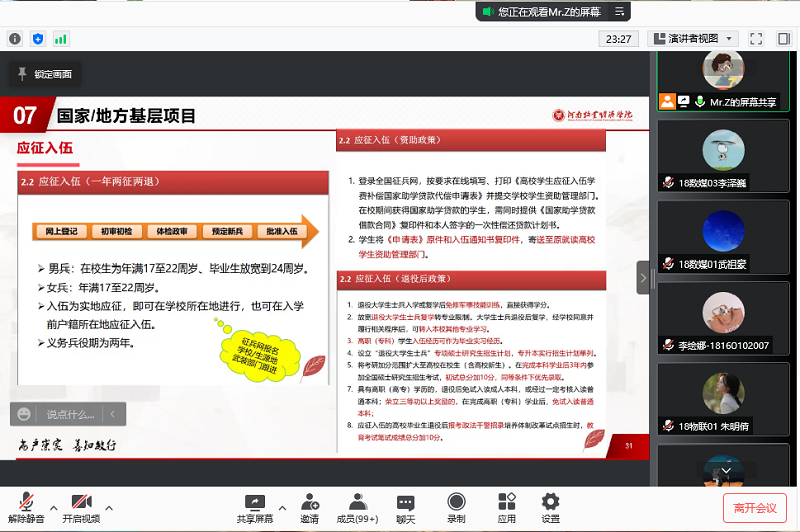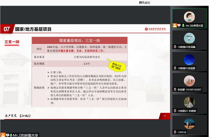 18级辅导员张紫烨老师在4月23日晚上召开了毕业生“走基层、促就业”线上专项主题班会,结合教育部发布的《关于做好2022届全国普通高校毕业生就业创业工作的通知》要求,针对“三支一扶”、“西部计划”、“特岗教师”、“老员工村官”、“参军入伍”、“直招士官”等中央基层就业项目的工作内容、报考流程和相关政策要求做了生动细致的宣传与讲解,并针对同学们的一些疑问进行在线解答。线下,张紫烨老师在办公室为部分对“西部计划”和“参军入伍”等基层项目感兴趣的同学进行答疑解惑,针对不同的同学提出了详细而具体的建议。
