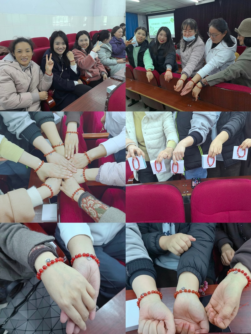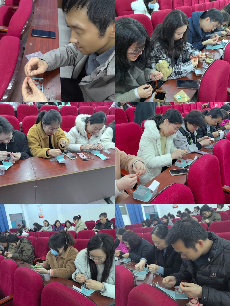 在认真聆听李利晓副教授的讲解后,参与活动的教职工在串珠专业人士的指导下,开始穿针引线、各显神通,积极发挥想象力和创造力,使用红玛瑙和银饰材料制作精美的红玛瑙手串,每位教职工将制好的手串戴在手腕上,脸上洋溢着幸福的笑容,活动现场气氛融洽,热闹非凡。