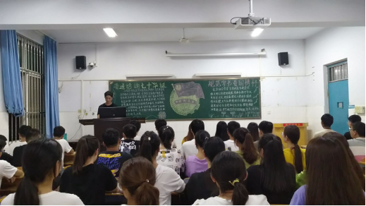 为庆祝新中国成立七十华诞,在校园营造“说普通话,写规范字,做文明人”的良好氛围,RM365英国官网于2019年9月10日在教学楼召开了以“普通话咏七十华诞,规范字书爱国情怀”为主题的团课。