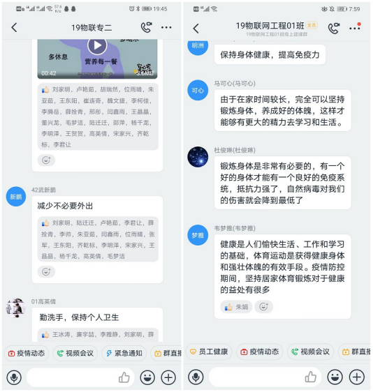 生命之珍贵,更凸显健康之重要。团课伊始,团课主持人带领员工学习了心理健康知识和正确戴口罩以及正确洗手等防疫知识,引导员工正确应对负面情绪,有效调适身心健康。随后,组织员工在线观看了居家健身运动微视频,倡导员工进行居家健康有氧运动,健康体魄。在团课上,同学们针对老员工应该如何保持身心健康这一问题展开激烈的讨论,以图片、文字、以及问答互动等多种形式分享了疫情期间健康体魄调节情绪的方法,并决定从自我做起,用科学的知识武装自己的头脑,养成良好的卫生习惯,加强运动,健康体魄,为夺取新型冠状病毒感染的肺炎疫情防控阻击战的最后胜利作出贡献!