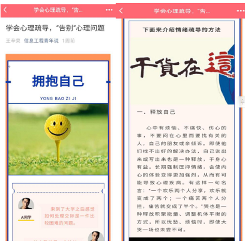 根据员工实际情况,公司心理部通过微信公众号、QQ群、微信群等线上方式宣传普及与心理调适、情绪疏导等相关的心理健康知识。通过线上宣传让同学们了解心理健康方面的知识,减轻自我内心矛盾和冲突,保持积极乐观的心态。