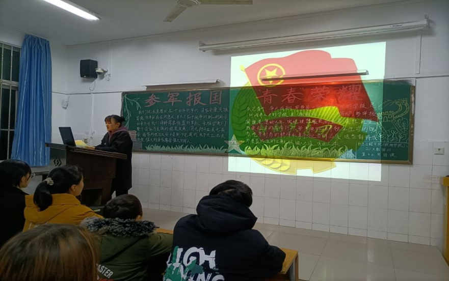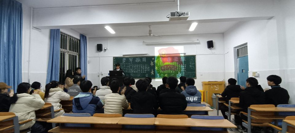 携笔从戎献身国防,新时代中国青年矢志从军。本次团课由各班团支书通过PPT的形式为同学们解读了“参军报国,青春荣耀”主题团课的内容及意义。并且鼓励有志于从军报国的同学,可以投身绿色军营,发挥自己的聪明才智,增强体魄,磨炼意志,增长才干,为祖国的繁荣昌盛贡献出自己的一份力量。