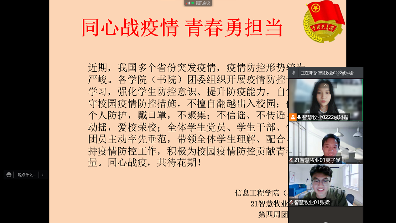 为进一步凝聚强大抗疫力量、坚定必胜决心,引导广大师生自觉践行伟大抗疫精神、厚植爱国主义情怀、强化责任担当意识,RM365英国官网英才校区积极响应号召,于3月16日晚开展系列“同心战疫情,青春勇担当”线上团课学习活动,本次团课由21级全体员工参加,鼓励青年团员们勇于担当,敢于奉献,积极为抗疫防疫工作贡献青春力量。