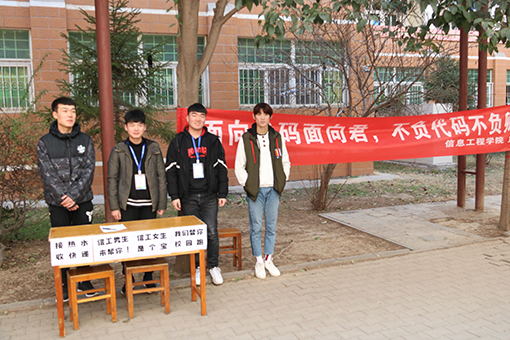 早上在副主席陈帅的安排下,提前在各个女生宿舍楼前挂了诙谐幽默的女生节宣传标语来烘托节日氛围。并且安排团学会男生于中午和晚上固定的时间段在女生宿舍楼前值班,帮助女生提水,领快递和校园跑以及做一些其他可以帮忙的事情。