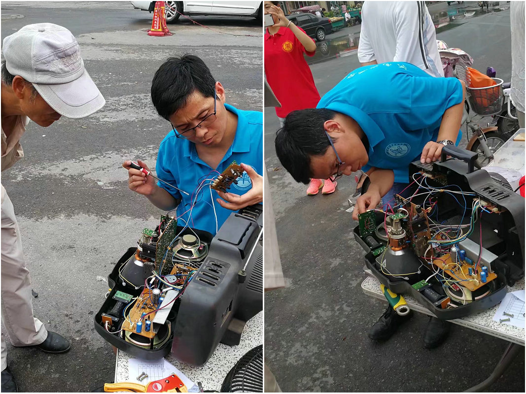 活动期间,买菁菁和孙汉卿两位老师带领同学们以饱满的热情投入到社区服务中。他们发挥自身专业和技术优势,相互配合、忙而不乱,不畏炎热酷暑,为市民们免费检测、维修家用电器300余件。看着员工志愿者们认真投入的身影,一位市民笑着说:“老员工有文化有技术就是好,我们这些电器坏了虽然有的自己能看懂,但是在技术上还是什么都不会,生活中这些高技术的工作真是难以解决”。暑期家电维修社会实践活动,不仅为同学们提供了投身社会、服务民生的机会,而且提高了大家的操作技能和专业素养。
