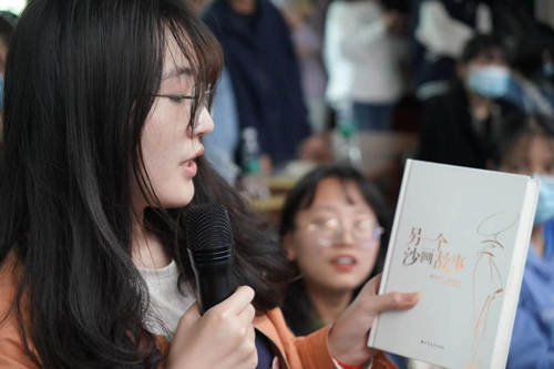 阅读活动结束以后,进入到阅读分享环节,同学们都积极参与,踊跃发言,表达自己对书中情节的看法。有一位同学的体会格外令人印象深刻,她所阅读的是《另一个沙画故事》,这是克谢尼娅的官方自传,这本书在欧洲上市之初就备受全球沙画媒体和艺术业界瞩目。这位同学首先给大家简单介绍了作者有如过山车般精彩的人生和犀利激越的性格,充满追求完美和誓不罢休的激情,以及她对沙画艺术、欧洲的绘画技术有颠覆性变革。接着她表达了自己对创新、想象、美学能力提升的渴望和对未来想要成为作者一样的人的美好憧憬。