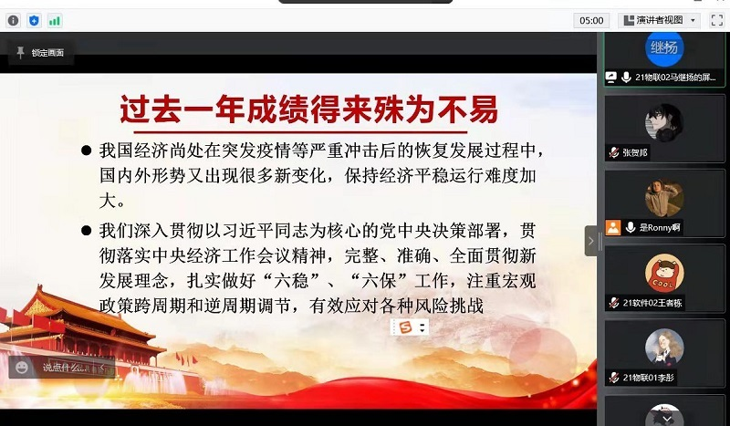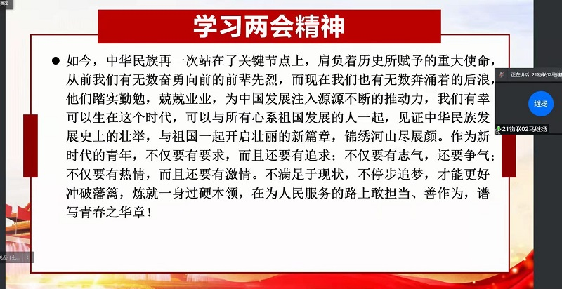 为深入学习贯彻两会精神,提高员工政治觉悟,凝聚青年奋进力量,RM365英国官网思源学社于3月29日晚线上开展了两会精神专题学习活动。