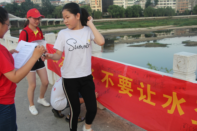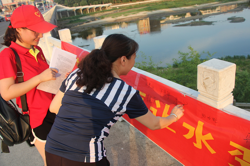 “红色筑梦团”针对不同主题分两队开展宣传教育活动。第一队志愿者在新县潢河大桥旁边对当地居民和过往游客行人分享预防未成年溺水的安全知识。他们用实际案例,分析了儿童溺水事故现状,给行人们介绍了游泳过程中应注意的问题、游泳中遇到紧急情况及溺水情况如何应对等,并劝阻未成年人勿去河流、水库、池塘等危险水域玩耍,尤其是不要随便或独自下沟渠池塘等地玩耍、捉鱼虾或捡拾东西,并向他们讲解了防溺水的重要性和必要性。志愿者还特别建议员工家长,遇到别人溺水,不盲目救人,平时注重提高孩子防溺水自觉性教育,培养孩子识别险情、紧急避险、遇险逃生能力;同时我们提醒未成年人家长切实做好孩童防溺水教育及监护工作。当地民众表示非常赞同这次主题教育,纷纷踊跃在预防溺水,不要让水变成亲人的眼泪红色条幅上签下自己的名字或留下祝福的话语,用实际行动践行自己的承诺。
